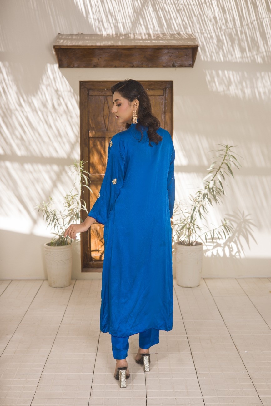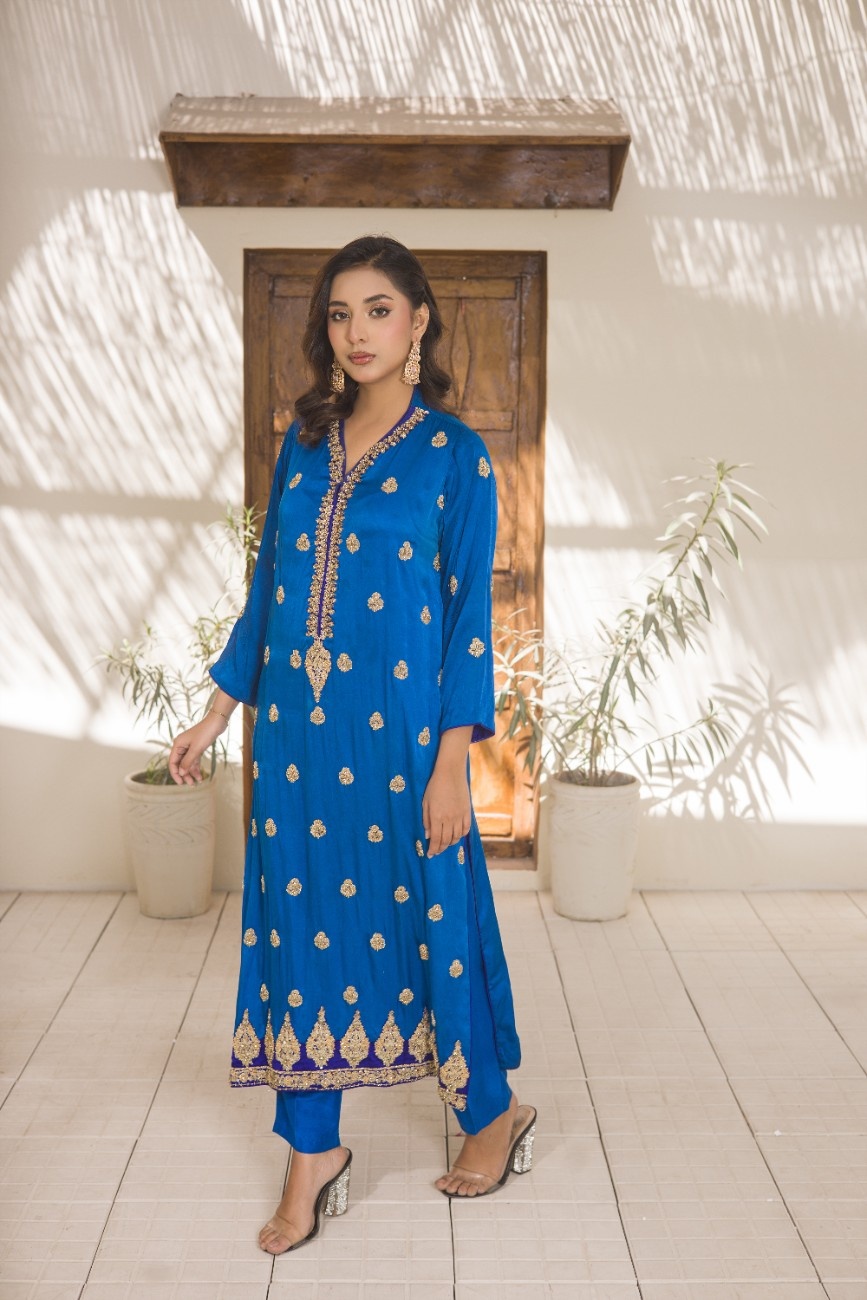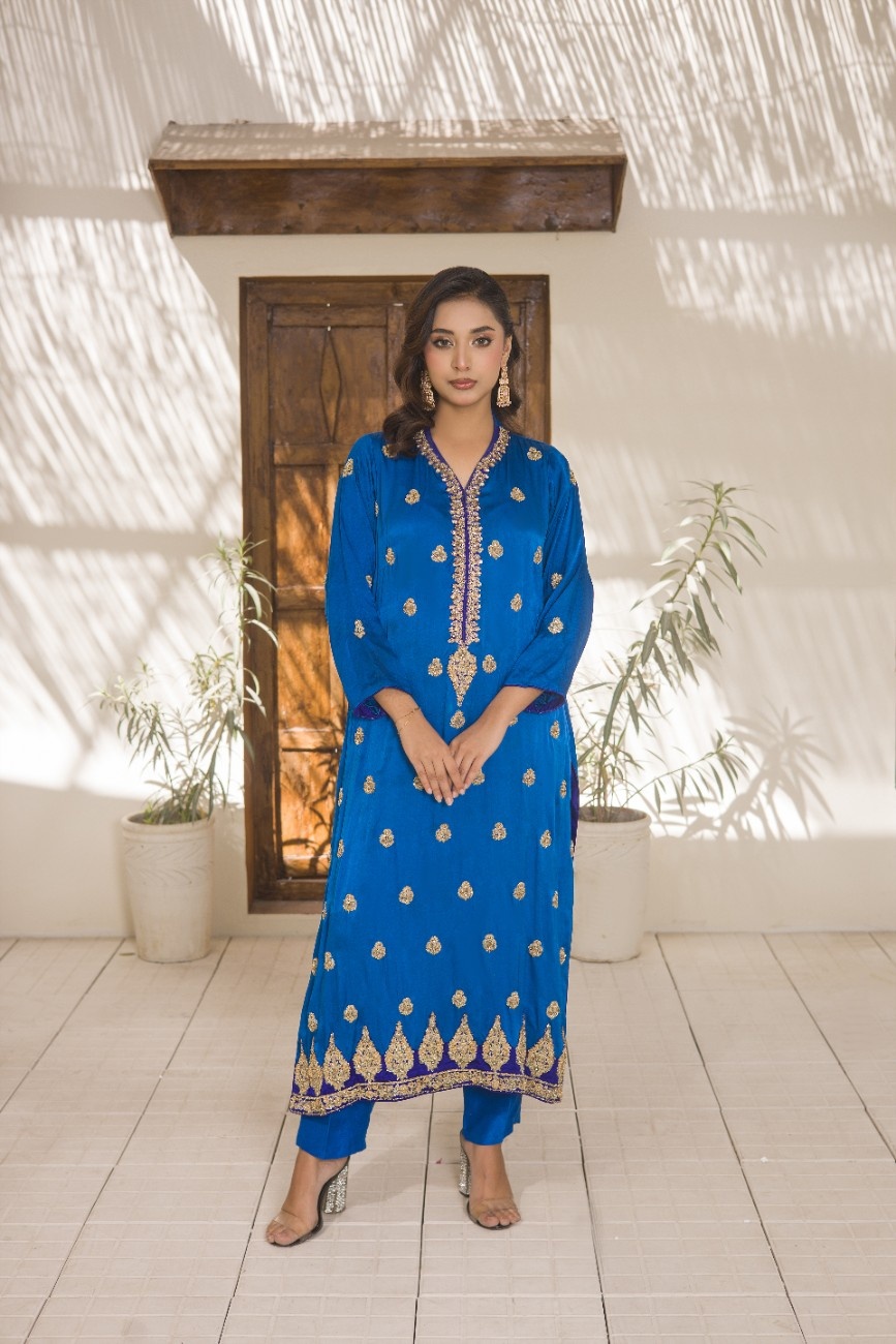 Elegant Silhouette: The outfit includes a sophisticated long kameez (shirt) and matching straight trousers, creating a timeless and elegant silhouette suitable for formal gatherings.