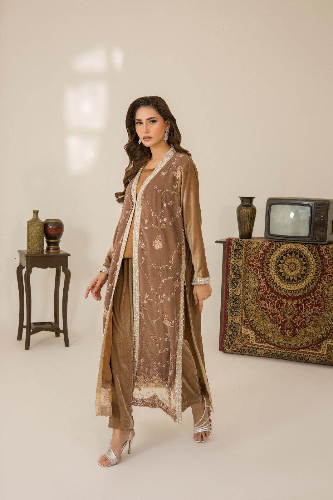 coffee valvet long shirt paired with same colour staright velvet pents and poly satain inner.