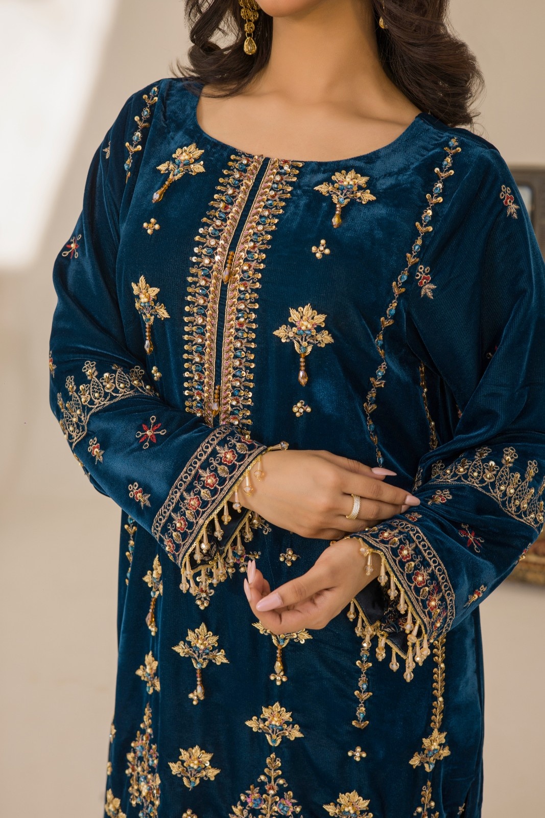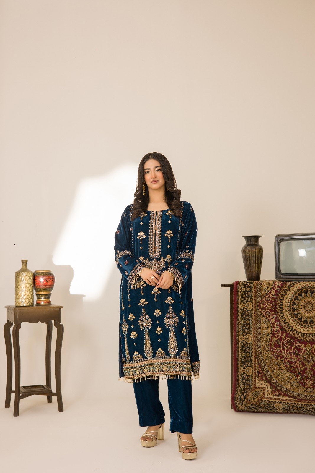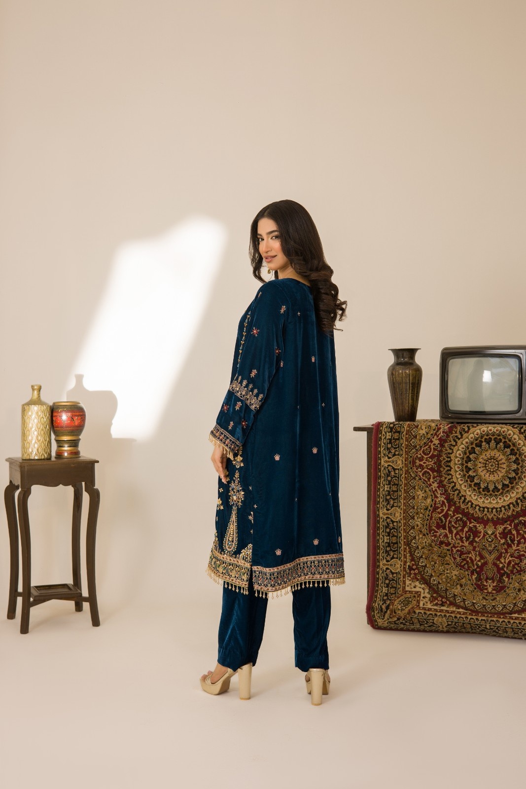 peacock blue valvet long shirt paired with same colour straight pents and poly satain inner