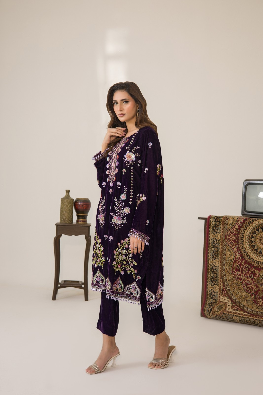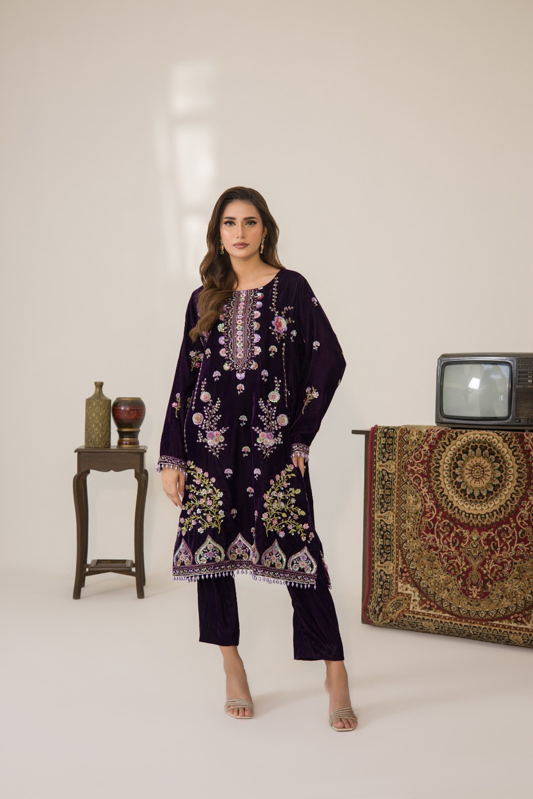 deep purple long velvet shirt paired with same colour straight pents and poly satin colour.